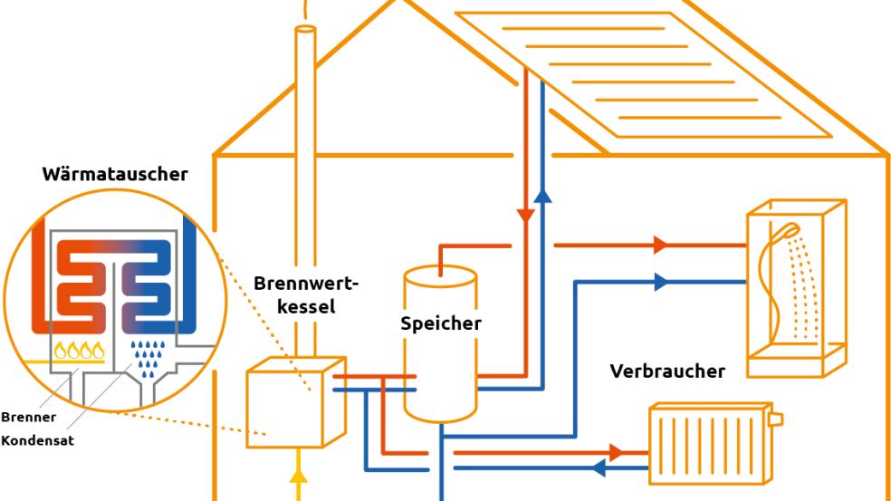 In älteren Standardheizungen entweicht Wasserdampf als Teil der bis zu 160 Grad heißen Abgase ungenutzt über den Schornstein – die darin gespeicherte Wärmeenergie geht verloren. In einem modernen Gas-Brennwertkessel hingegen werden die heißen Verbrennnungsgase am abgekühlten Wasser, das aus den Heizkörpern zurückfließt, vorbeigeleitet. Der Wasserdampf kühlt ab, kondensiert und setzt dabei Wärme frei. Diese Kondensationswärme wird zusätzlich zur Erwärmung des Heizwassers genutzt. Auf diese Weise können Wirkungsgrade von bis zu 98 Prozent erreicht werden.