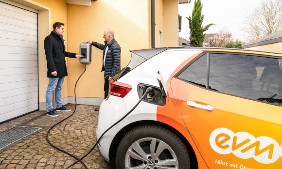 Tagsüber fahren – abends laden: Mit einer Wallbox lassen sich E-Autos bequem an das heimische Stromnetz anschließen. Elf Kilowatt Ladeleistung reichen normalerweise, so Daun, um das Auto über Nacht aufzuladen. Der E-Auto-Fan tauscht sich in einem Club mit anderen Elektromobilisten und -mobilistinnen aus. So verbinden sich bei ihm Enthusiasmus und berufliches Interesse. Denn die evm bietet Umsteigern ein Komplettpaket, das die Wallbox für das Heimladen, deren Installation sowie den Bezug von Grünstrom umfasst. Mehrere Hundert dieser Paketlösungen sind bereits vermarktet.
