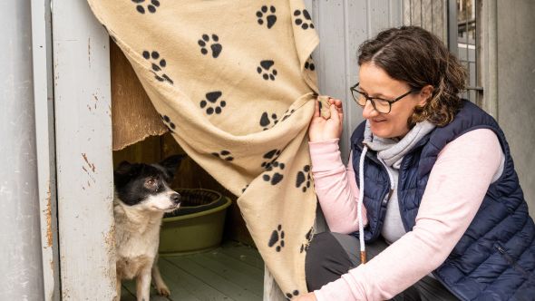 Jeden Dienstag tritt Andrea Opper den Weg zum Tierheim des Vereins Glückshunde e. V. in Ransbach-Baumbach an. Ein schmaler und matschiger Waldweg gibt nach und nach den Blick auf ein einstöckiges Gebäude frei. Vieles wirkt alt und provisorisch. Beim Näherkommen wird schnell klar: Das Tierheim braucht Unterstützung. Die Hunde heißen den bekannten Besuch im Eingangsbereich mit lautem Bellen und freudigem Schwanzwedeln willkommen. Seit rund eineinhalb Jahren engagiert sich Andrea Opper, die im Marketing der evm arbeitet, einmal pro Woche nach Feierabend im Tierheim. „Ich kannte das Tierheim bereits aus den sozialen Medien. Darüber habe ich es auch kontaktiert, und wir haben zunächst ein Probearbeiten vereinbart“, erinnert sie sich. Seitdem hilft sie wöchentlich beim Füttern, Saubermachen sowie Gassigehen und unterstützt das Tierheim beim Internetaufritt und bei der Pressearbeit.