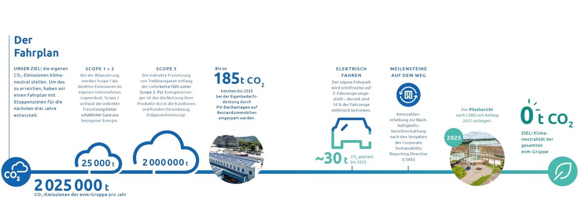 Seit fast vier Jahren arbeitet Sabrina Scheske als Mitglied des Projektteams „Die klimaneutrale evm-Gruppe“ daran, diesen Titel mit Leben zu füllen. „Das bedeutet: Wir streben in allen Bereichen ein hohes Maß an Umweltverträglichkeit, Energieeffizienz und Ressourcenschonung an“, sagt sie. Als Grundlage für die Bilanzierung von Treibhausgasemissionen nutzt die Projektgruppe das internationale Greenhouse-Gas(GHG)-Protokoll. Es teilt die Emissionen in drei Geltungsbereiche ein, sogenannte Scopes. Zu Scope 1 gehören alle Emissionen, die dem Unternehmen direkt zuzuordnen sind, zum Beispiel die Abgase der Unternehmensfahrzeuge oder der Energieverbrauch in den Büros. Indirekte Emissionen aus gekauftem Strom, Wärme und Dampf fallen unter Scope 2. Emissionen, die entlang der Wertschöpfungskette entstehen, zählen zu Scope 3. Für die evm-Gruppe sind das vor allem die Nutzung der Produkte wie Strom und Erdgas durch die Kundinnen und Kunden.