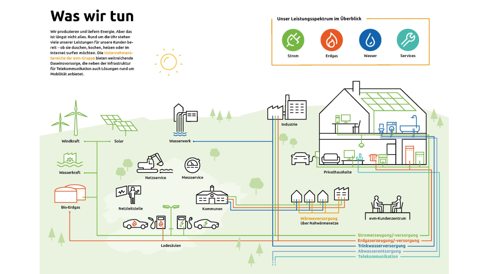 Die evm liefert Energie. Aber das ist längst nicht alles. Rund um die Uhr stehen viele Leistungen für die Kunden bereit – ob sie duschen, kochen, heizen oder im Internet surfen möchten. Die Unternehmensbereiche der evm-Gruppe bieten weitreichende Daseinsvorsorge, die neben der Infrastruktur für Telekommunikation auch Lösungen rund um Mobilität anbietet.